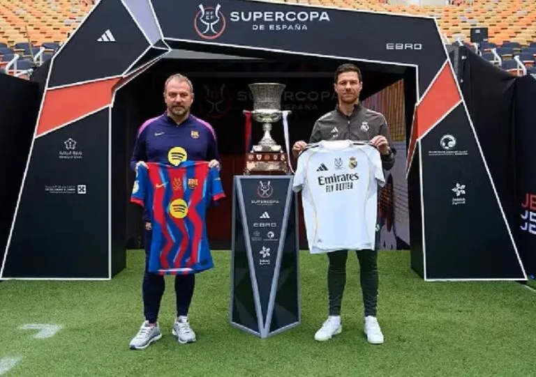 Hansi Flick y Xabi Alonso posan en la previa con el trofeo de la Supercopa de España, que Barcelona y...